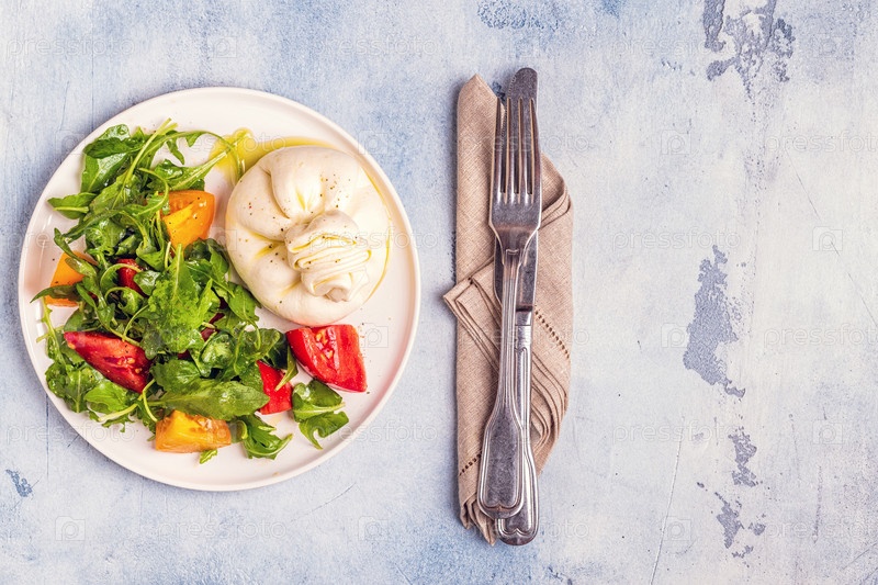 Итальянский сыр Буррата со свежей рукколой, помидорами, оливковым маслом