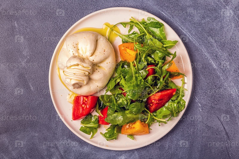 Итальянский сыр Буррата со свежей рукколой, помидорами, оливковым маслом