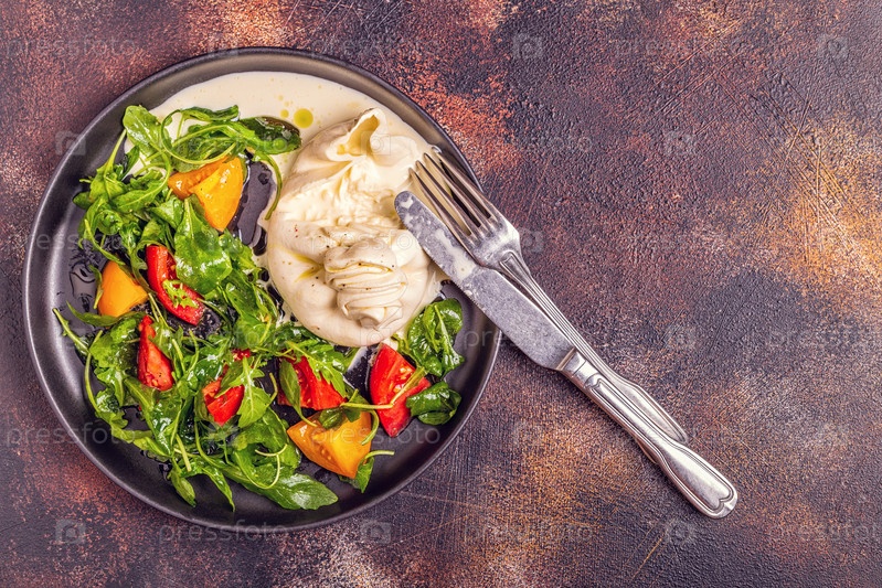 Итальянский сыр Буррата со свежей рукколой, помидорами, оливковым маслом