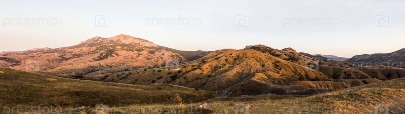 Удивительная панорама крымских холмов на рассвете, летнее время, северо-восток Крыма