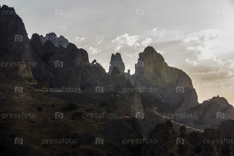 Пейзаж знаменитых скальных образований, заливы у потухшего вулкана Карадаг Гора в Карадагском заповеднике на северо-востоке Крыма, Черное море