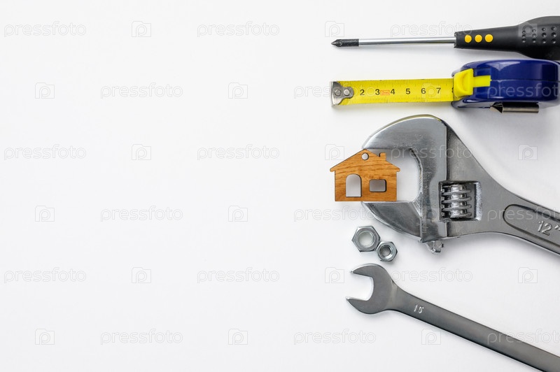 Строительные инструменты и небольшой дом, зажатый в ключе на белом фоне. Слева пустое место