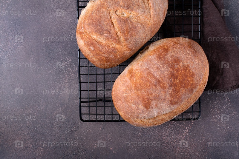Ржаной хлеб на закваске без дрожжей. Две буханки на охлаждающей стойке. Домашнее хлебобулочное изделие. Вид сверху