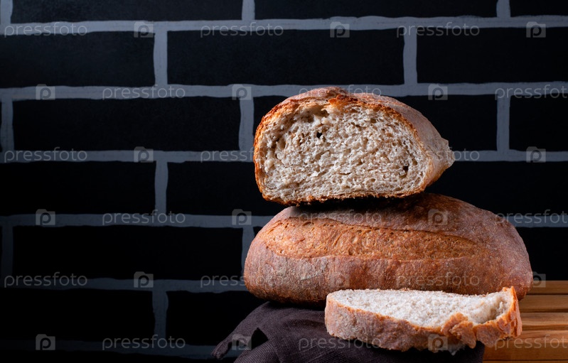 Ржаной хлеб на закваске без дрожжей на фоне черной кирпичной стены. Кусок домашней выпечки