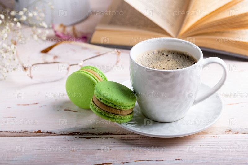 Французский десерт миндальное печенье. Два зеленых миндального печенья и белая чашка кофе на белом деревянном столе на фоне открытой книги