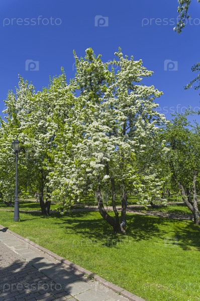 Цветущие груши в парке Коломенское, Москва, Россия. Солнечный день в мае