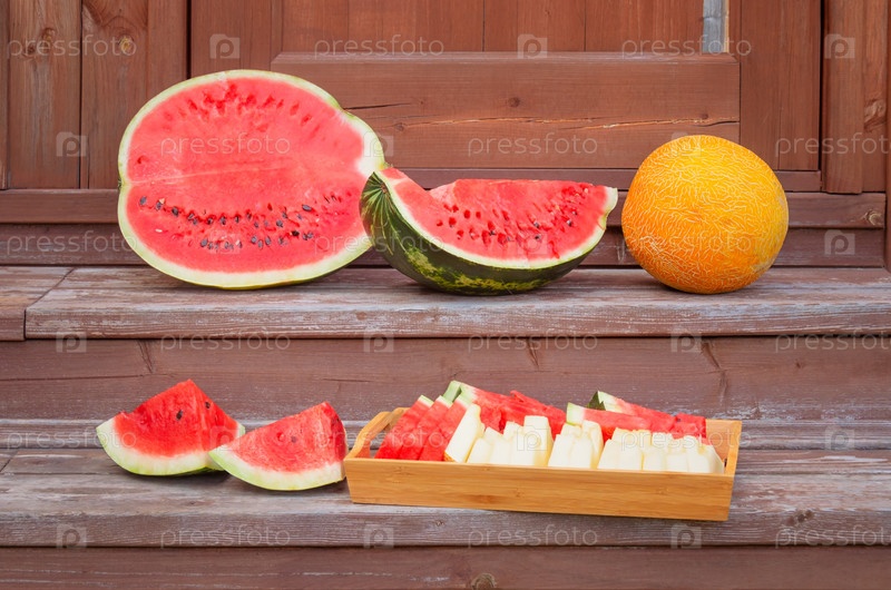 Арбуз, дыня и кусочки арбуза и дыни на ступеньках деревенской деревянной лестницы