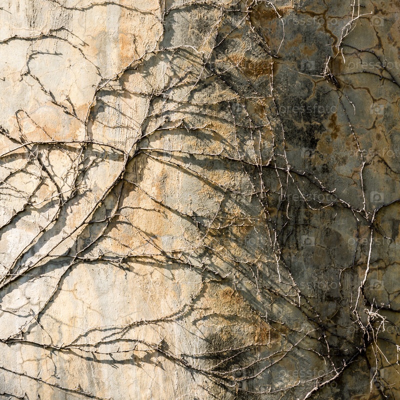 Старая текстурированная цементная стена с сухими ветвями на ней. Абстрактный фон текстуры камня