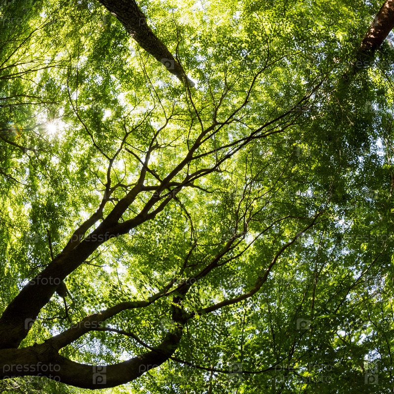 Солнечный лес. Лучи солнца пробиваются сквозь пышную листву