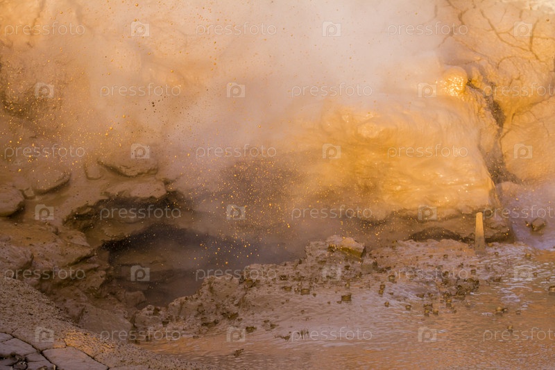 Дымящиеся, серные, активные фумаролы возле Паужетской ГеоЭС, Камчатка, Россия