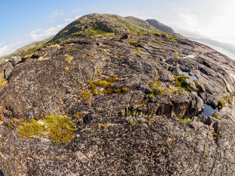 Береговая линия Баренцева моря северным полярным летом. Северный Ледовитый океан, Кольский полуостров, Россия. Объектив «рыбий глаз»