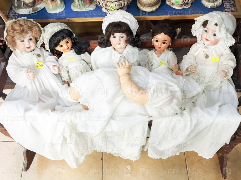 Старые разные куклы для продажи на блошином рынке в старом городе Яффо, Тель-Авив, Израиль