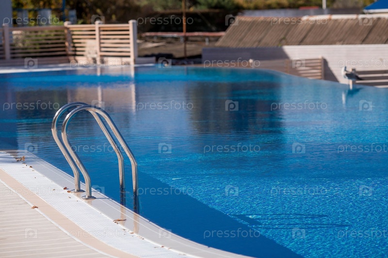 Баннер. Бассейн с ярко-голубой водой и металлическая лестница в отеле