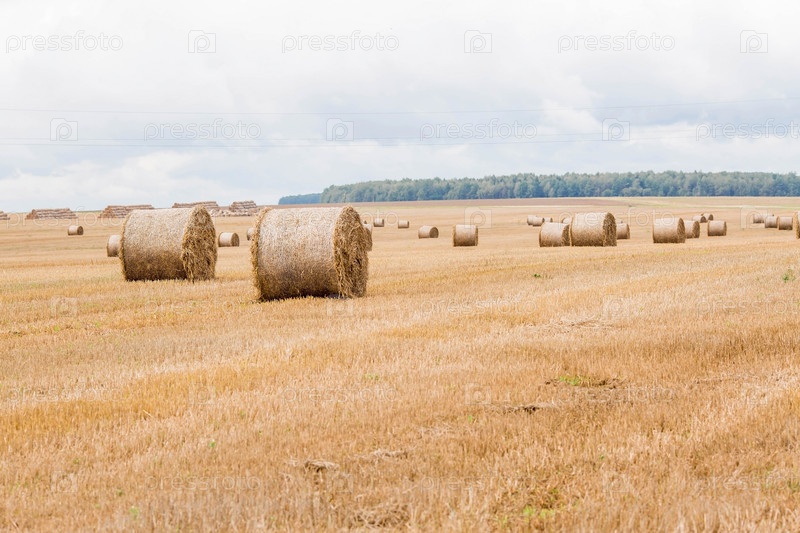 Сельскохозяйственные работы. Сено валяется на поле. Стога сена. Сбор урожая. Конец лета