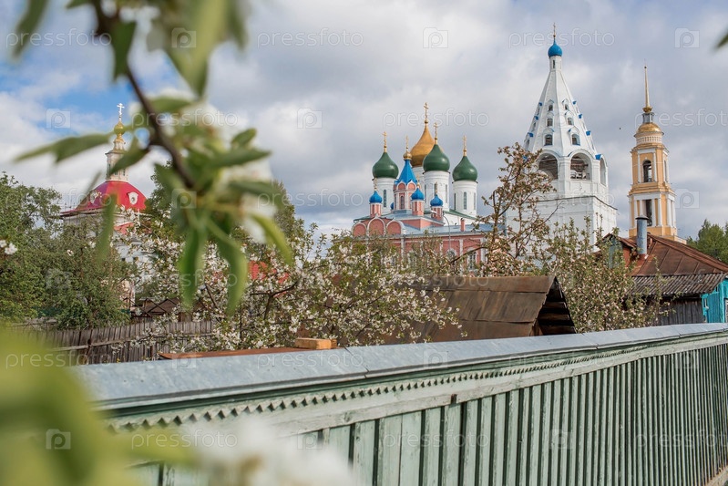 Успенский собор, Тихвинская церковь в Коломне. Красивая архитектура города на фоне голубого неба. Визитная карточка города Коломны