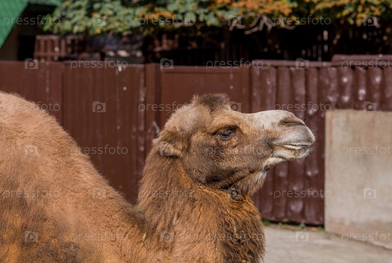 Зоопарк. Портрет улыбающегося верблюда. Крупный план головы животного. Московский зоопарк