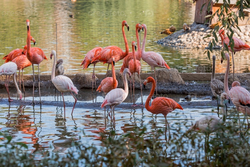 Птицы. Розовые и ярко-красные фламинго в Московском зоопарке