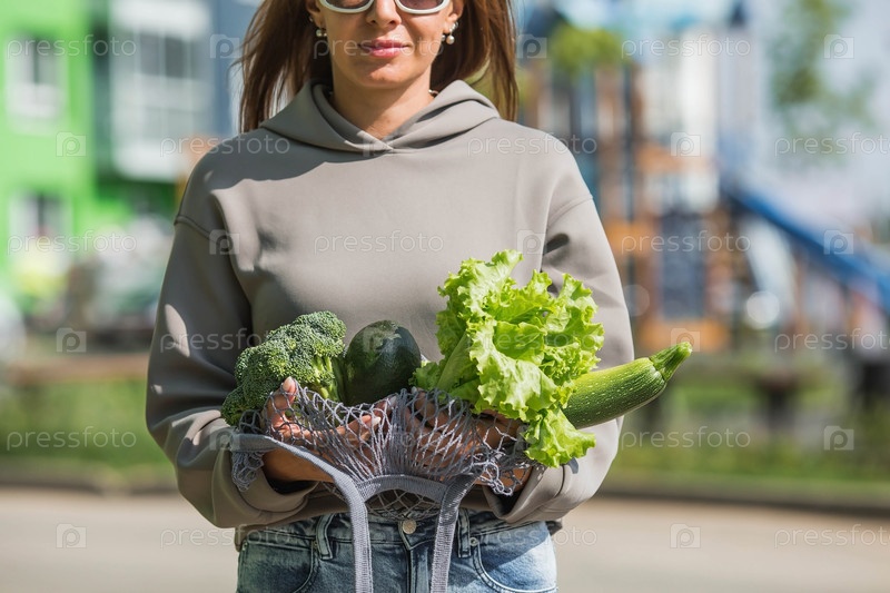 Современная стильная женщина с сумкой для покупок, покупающая зеленые овощи на фоне города. Концепция здорового питания, вегетарианства и экологии. Отказ от полиэтиленовых пакетов