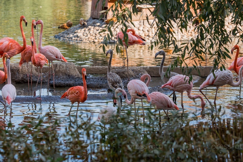 Птицы. Розовые и ярко-красные фламинго в Московском зоопарке