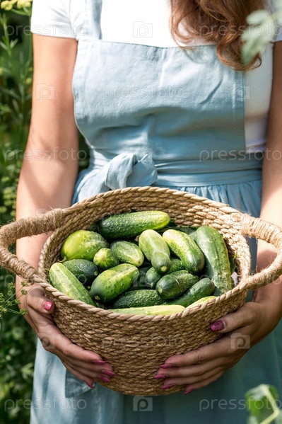 Руки девушки с плетеной корзиной крупным планом. Фермерша в хлопковом фартуке держит огурцы. Концепция сбора урожая в теплице