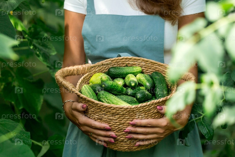 Руки девушки с плетеной корзиной крупным планом. Фермерша в хлопковом фартуке держит огурцы. Концепция сбора урожая в теплице