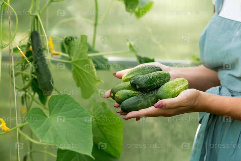 Фермер в хлопковом фартуке собирает огурцы в теплице