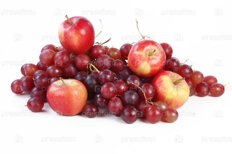 Грозди красного винограда и яблок на белом фоне