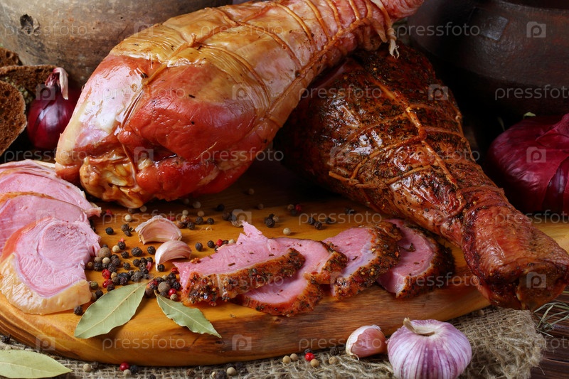 Копченые индюшиные голени на деревянном фоне