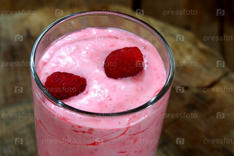 Смузи из спелой малины, йогурта и орехов в прозрачном стакане