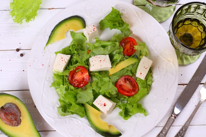 Салат с авокадо, сыром,томатами и вином на белом фоне