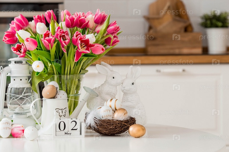 Букет тюльпанов, пасхальные кролики и яйца с золотым узором на столе. На заднем плане белая кухня в скандинавском стиле. Красивая открытка. Минимальная концепция