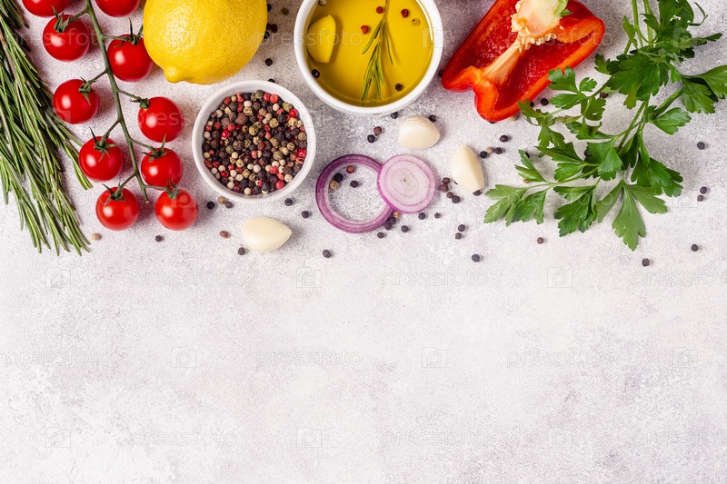 Травы и приправы на светлом каменном фоне
