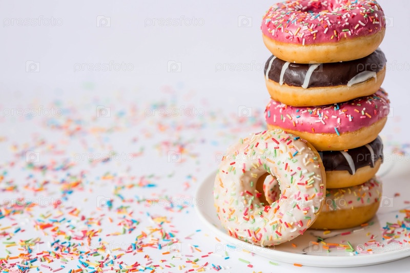 Вкусный десерт. Розовые, белые и шоколадные пончики с разноцветными брызгами на белом фоне сладостей. Кондитерские изделия