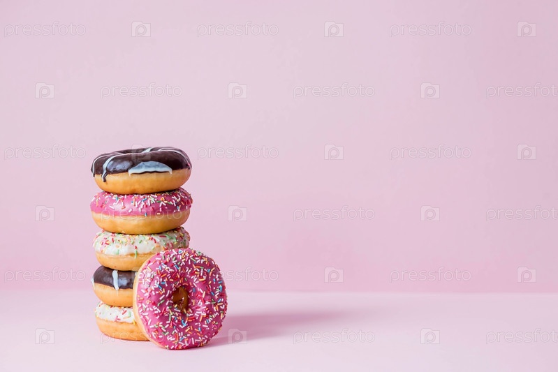 Вкусный десерт. Розовые, белые и шоколадные пончики с разноцветными брызгами на розовом фоне сладостей. Кондитерские изделия