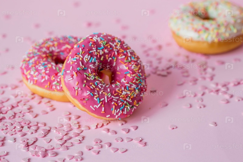 Вкусный десерт. Розовые пончики с разноцветными брызгами на розовом фоне сладостей. Кондитерские изделия