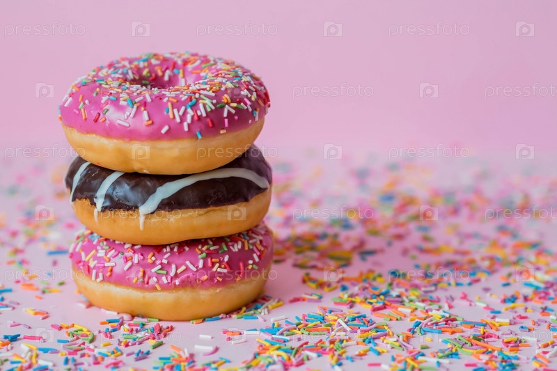 Вкусный десерт. Розовые, белые и шоколадные пончики с разноцветными брызгами на розовом фоне сладостей. Кондитерские изделия