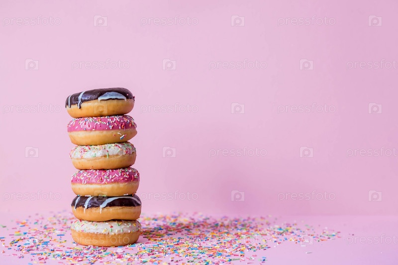 Вкусный десерт. Розовые, белые и шоколадные пончики с разноцветными брызгами на розовом фоне сладостей. Кондитерские изделия