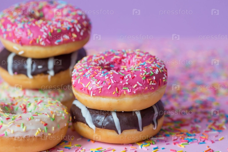 Вкусный десерт. Розовые, шоколадные и белые пончики с разноцветными брызгами на фиолетовом фоне сладостей. Кондитерские изделия