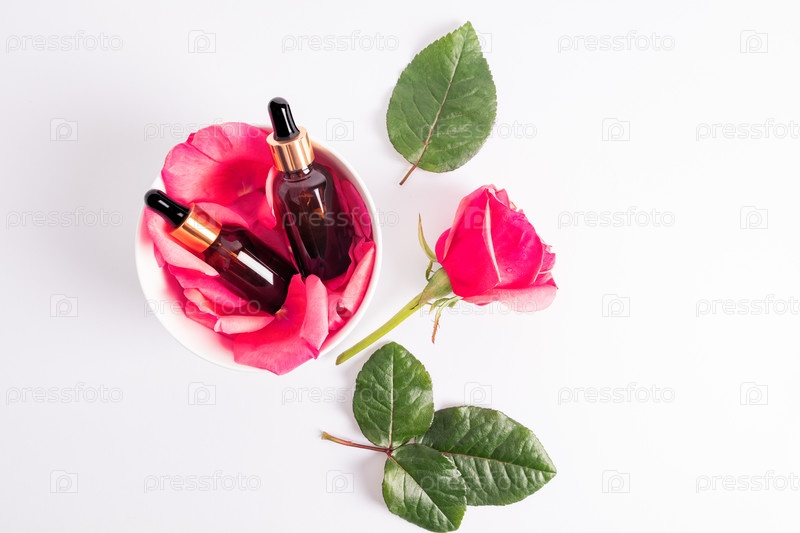 Две косметические бутылочки с золотой крышкой и пипетка с натуральным розовым маслом или увлажняющей сывороткой для ухода за собой лежат в миске с лепестками роз. Вид сверху