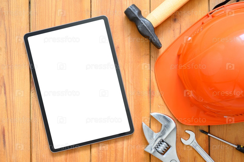 Планшет с белым пустым дисплеем рядом со строительной каской и инструментами. Вид сверху, макет