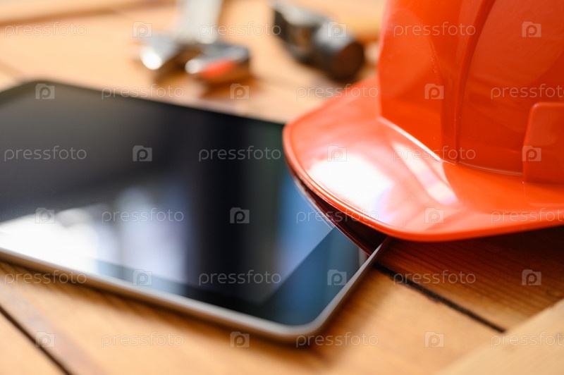 Планшет и строительная каска крупным планом. Расфокусировка, узкий фокус на забрале шлема. Концепция строительства