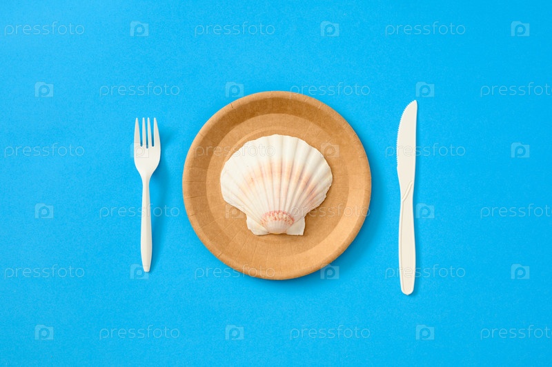 Большая раковина на бумажной тарелке на синем фоне. Доставка морепродуктов. плоская планировка