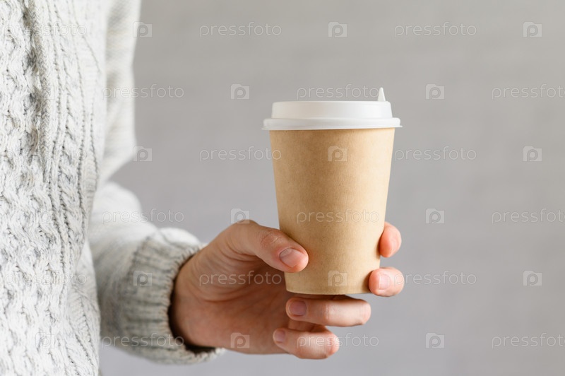 Крупным планом мужчина держит в руке одноразовый бумажный стаканчик с кофе. Селективный фокус на чашке, шаблоне