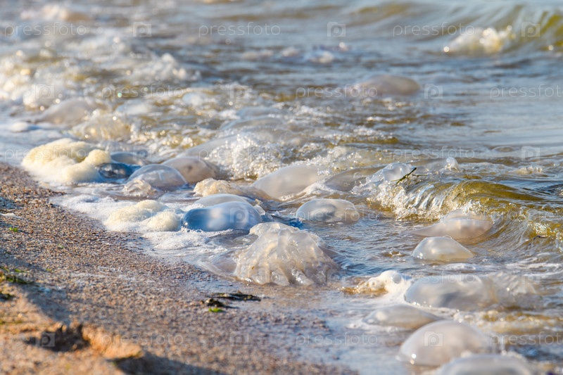 На берегах Азовского моря много мертвых медуз. Нашествие медуз из-за глобального потепления и повышения солености. Селективный фокус на одной медузе