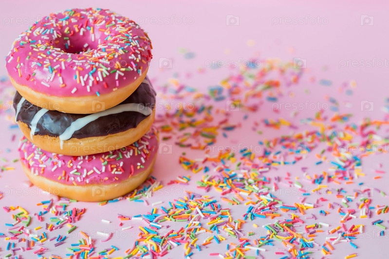 Вкусный десерт. Розовые, белые и шоколадные пончики с разноцветными брызгами на розовом фоне сладостей. Кондитерские изделия