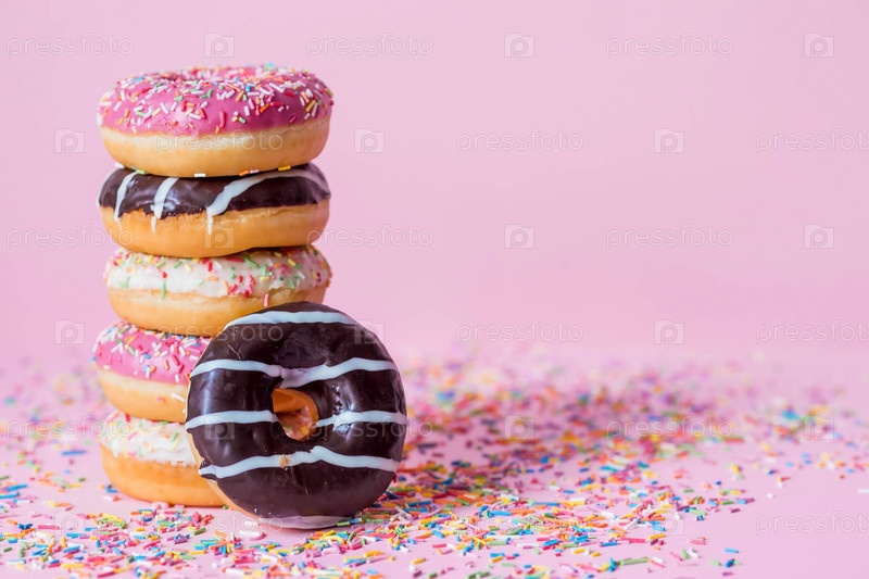 Вкусный десерт. Розовые, белые и шоколадные пончики с разноцветными брызгами на розовом фоне сладостей. Кондитерские изделия