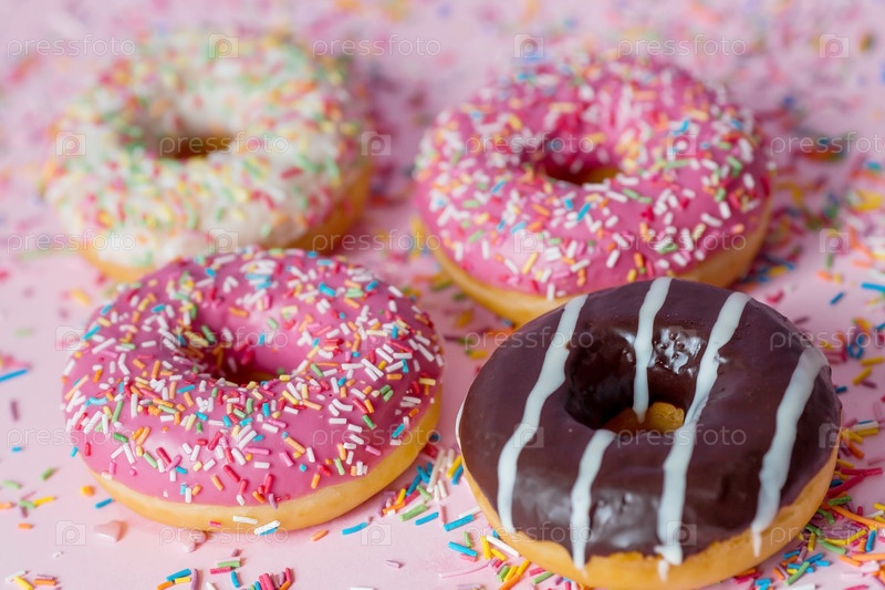 Вкусный десерт. Розовые, белые и шоколадные пончики с разноцветными брызгами на розовом фоне сладостей. Кондитерские изделия
