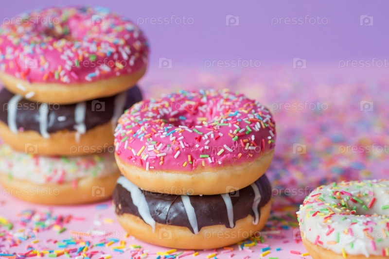 Вкусный десерт. Розовые, шоколадные и белые пончики с разноцветными брызгами на фиолетовом фоне сладостей. Кондитерские изделия
