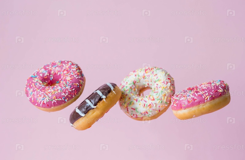 Вкусный десерт. Розовые, шоколадные и белые пончики с разноцветными брызгами на розовом фоне. Еда находится в воздухе. Левитация. Сладости. Кондитерские изделия