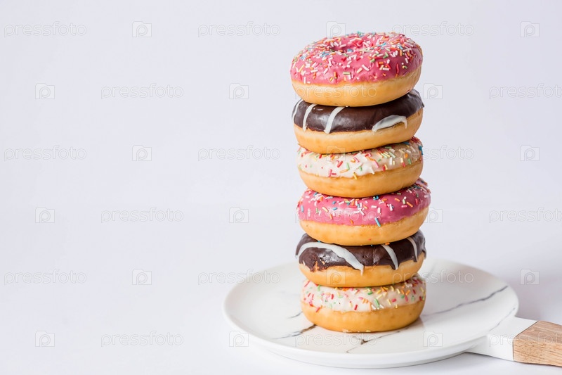 Вкусный десерт. Розовые, белые и шоколадные пончики с разноцветными брызгами на белом фоне сладостей. Кондитерские изделия
